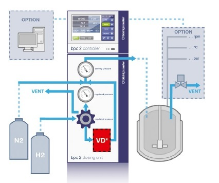 - bpc 2(Buchiプレスフローコントローラー)は、水素の投与、反応圧力の制御、飽和までの水素吸収の連続測定に使用されます。