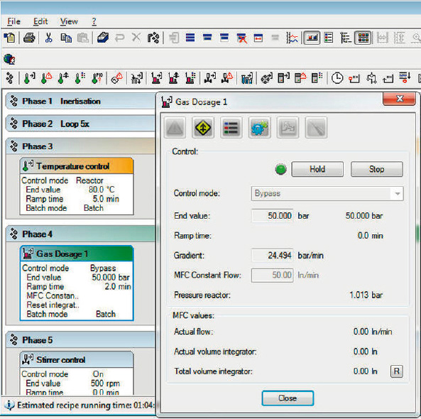 制御パラメータは、反応圧力、温度、ガス、液体流量、ガス消費量、スターラー速度、安全限界値など です。