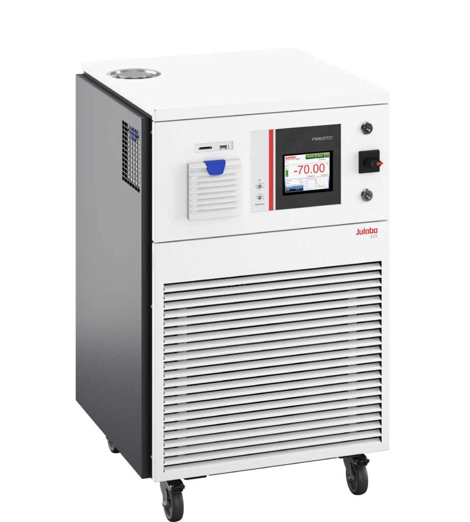 空冷式の PRESTO A70 は、JULABO の最もコンパクトな 2 段階プロセス システムであり、-75℃までの最低温度で高い冷却能力を提供します。